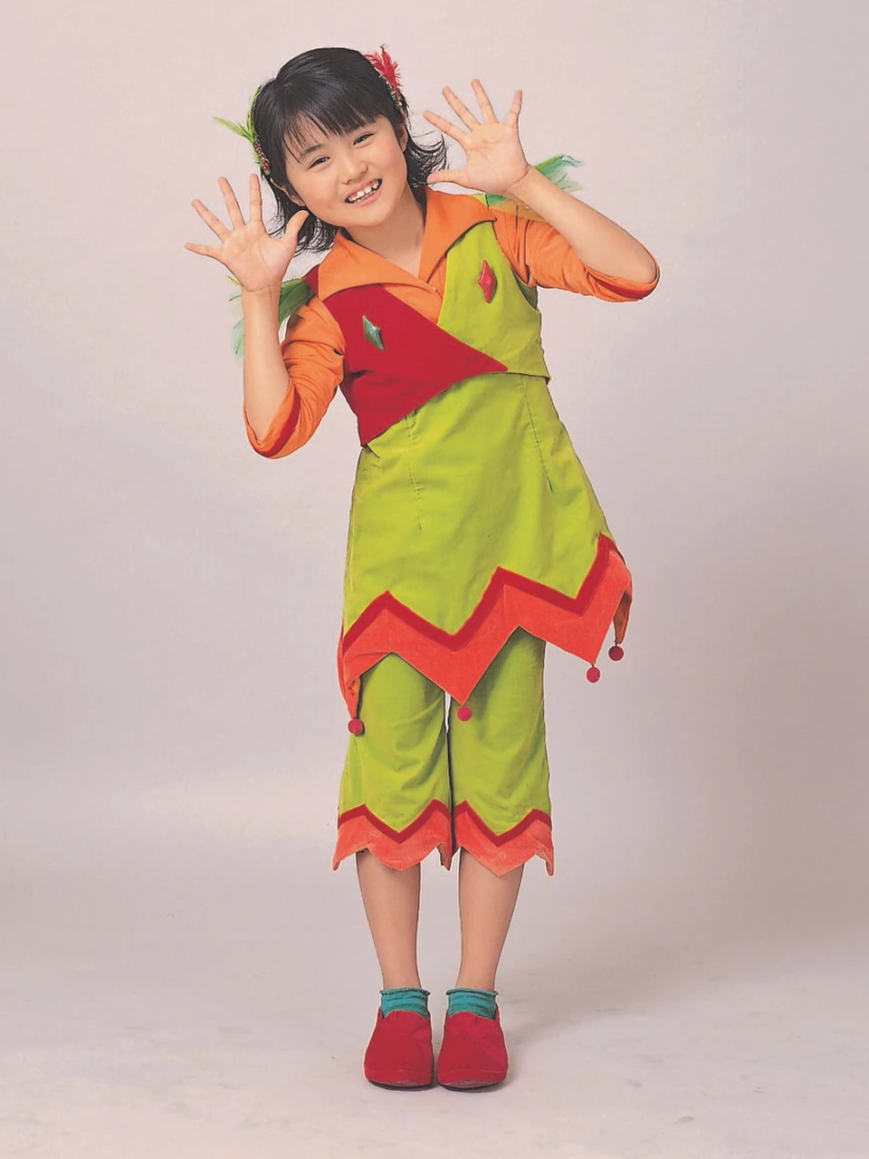 一頭黑色翻翹短髮,頭上有两根羽毛髮飾(左红右绿);身穿主色调为黄绿色的精灵装,並以紅色和橙色裝飾。上身穿橙色七分袖衬衫,袖口处有红色滚边;马甲一半红一半绿,肩膀上还有绿色疑似翅膀的东西;胸前两边都有一颗菱形胸饰,左边为红色,右边为深绿色。裙子和裤子是黄绿色,橙色锯齿边有小球坠饰,绿色和滚边之间还有一条红色滚边。脚穿深绿色短袜和红色翘头鞋。